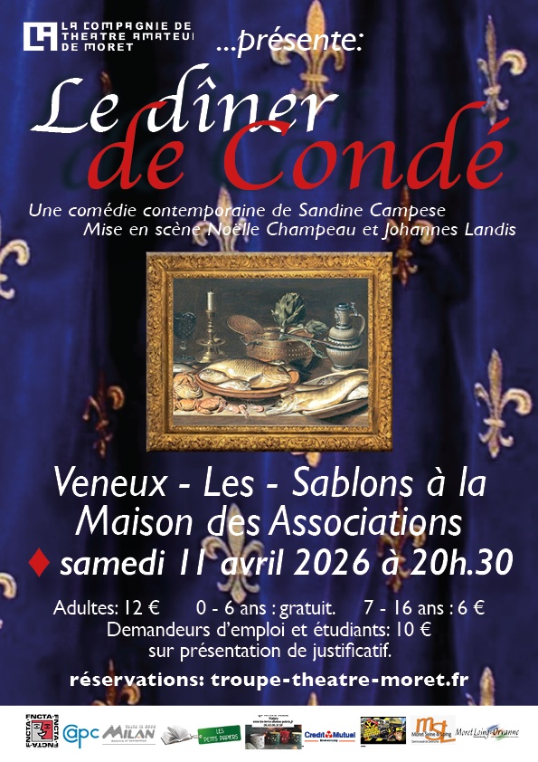 À Moret, notre compagnie amateur vous embarque dans Le Dîner de Condé de Sandrine Campese : une comédie hystérico-historique qui plonge dans les coulisses de la grande cuisine du XVIIe siècle, avec François Vatel en chef d’orchestre… et une équipe (très) difficile à tenir.